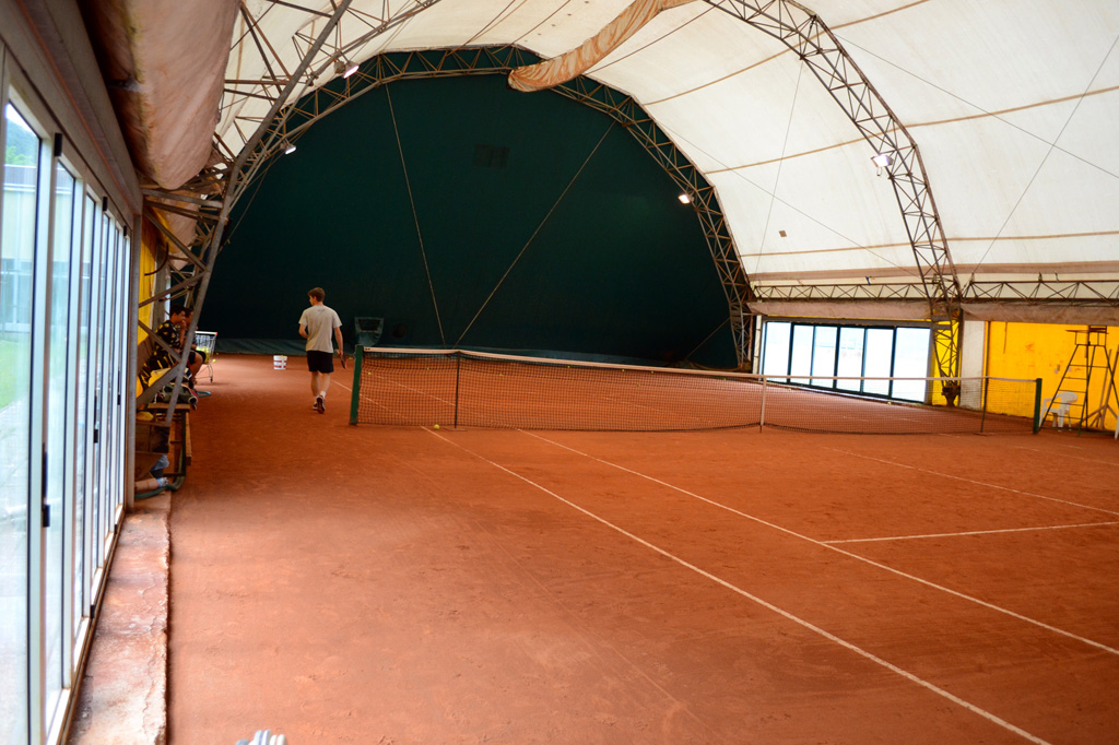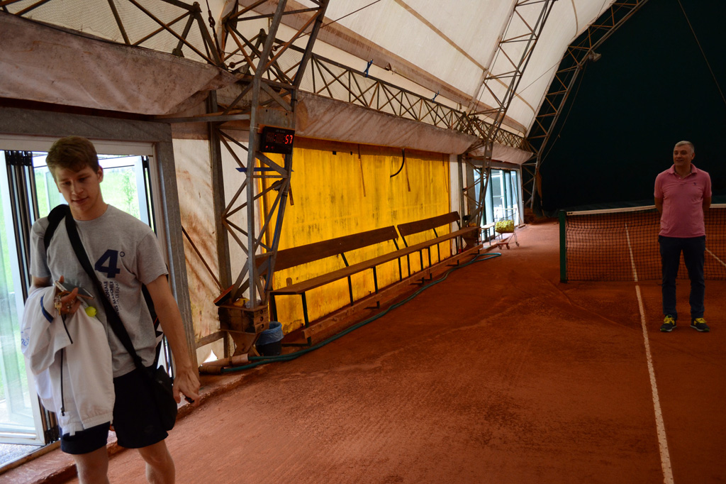 Luca prides himself on the new clubhouse. The building matches the red clay of the indoor court. In the bar, old racquets hang on the walls beside posters of upcoming tournaments. Players gather on the plaid couch by the beer cooler or outdoor picnic table. White and beige tiles cover the walls of the new bathrooms above wooden benches and spotless showers.